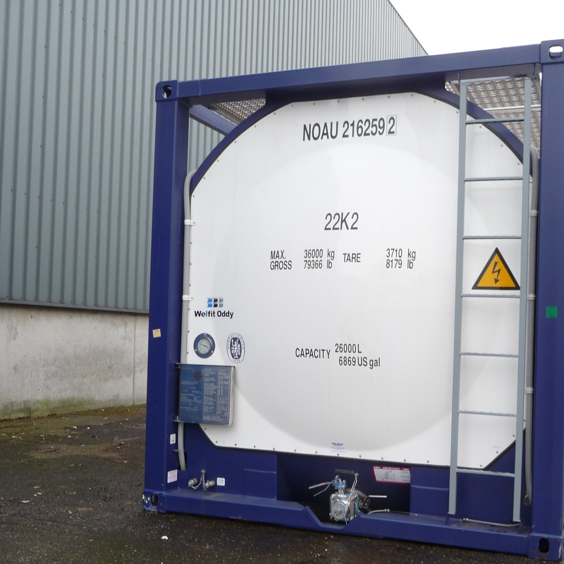 Predominantly 20ft containers for dangerous liquids or non-hazardous liquids, also for food. Tank containers can be used worldwide. These are also often used as buffer tanks for the supply of drinking water. Tank containers can be heated or cooled.